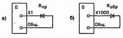 Рис. 4.10. Схема проверки исправности диода: измерение прямого (а) и обратного (б) сопротивлений