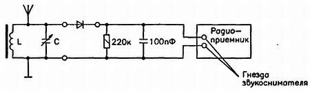 Исправность высокочастотных диодов можно проверить включением их в схему работающего простейшего детекторного радиоприемника, как показано на рис. 4.11. Нормальная работа радиоприемника говорит об исправности диода, а отсутствие приема — о пробое.