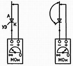 Простейший способ проверки тиристоров представлен на рис. 4.12. Сопротивление исправного тиристора составляет несколько мегаом, а пробитого — близко к нулю. Если анод исправного тиристора соединить на мгновение с управляющим электродом (УЭ), прибор покажет сопротивление короткого замыкания.
