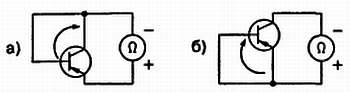 При ремонте бытовой радиоаппаратуры часто возникает необходимость проверить исправность полупроводниковых транзисторов без выпаивания из схемы. Один из способов проверки — измерение омметром сопротивления между выводами эмиттера и коллектора при соединении базы с коллектором (рис. 4.14а) и соединении базы с эмиттером (рис. 4.14б). При этом источник коллекторного питания отключают от схемы. Если транзистор исправен, в первом случае омметр покажет малое сопротивление, во втором — порядка нескольких десятков или сотен килоом.