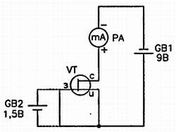 При измерении параметров полевого транзистора с р-n переходом и каналом пятила полярность включения миллиамперметра РА, батареи GB1 и элемента GB2 должна быть обратной.
