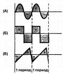 Рис. 30-1. Три основные формы периодического сигнала: (А) синусоидальная, (Б) прямоугольная, (В) пилообразная.