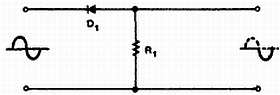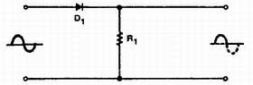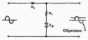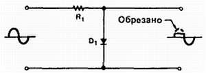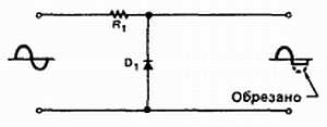 Цепь параллельного ограничения выполняет те же функции, что и последовательный ограничитель (рис. 30–21). Разница состоит в том, что диод включен параллельно выходу. Эта цепь обрезает отрицательную часть входного сигнала.