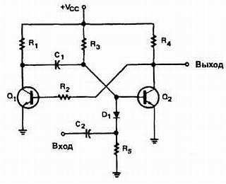 Цепь обычно находится в стабильном состоянии. Под воздействием входного пускового сигнала, она переключается в нестабильное состояние. Время нахождения схемы в нестабильном состоянии определяется постоянной времени RC цепочки, состоящей из резистора R2 и конденсатора С1. Конденсатор С2 и резистор R5 образуют дифференцирующую цепь, преобразующую входной импульс в положительный и отрицательный пики. Диод D1 позволяет пройти только отрицательному пику, включающему цепь.