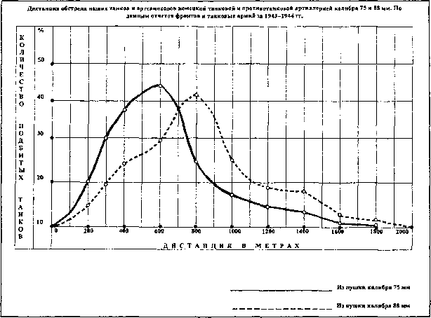 [У немцев для 75-мм пушек наиболее эффективная дистанция поражения советских танков была 600 м, а для 88-мм пушек — 800 м. Советские военные инженеры по фактическим поражениям пушек построили график. — А.Ш.] В обороне при стрельбе с места необходимым условием является внезапное открытие огня и наличие запасных танковых капониров для быстрой и скрытой смены огневых позиций. В наступлении на обороняющегося противника основными видами огня является стрельба с ходу и с коротких остановок. При атаке переднего края обороны противника танки открывают мощный огонь из всех видов оружия по известным огневым точкам, а также по местам вероятного их нахождения, в момент прохождения боевых порядков пехоты, изготовившейся к атаке. Стрельба с ходу, несмотря на то что меткость её значительно падает, оказывает на противника ошеломляющее воздействие. 4 июня 1943 года, после артналёта, танки 240-го танкового полка совместно со стрелковыми батальонами атаковали противника на высоте 253,0, ведя интенсивный огонь с ходу. Противник, потеряв до 150 человек убитыми, 6 противотанковых орудий, 17 пулемётов и другое вооружение, в беспорядке отошёл. В бою под Богуславкой расчёты противотанковых орудий противника, деморализованные огнём с ходу танков КВ 29-го гвардейского танкового полка прорыва, в панике бежали с поля боя, побросав своё вооружение.