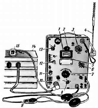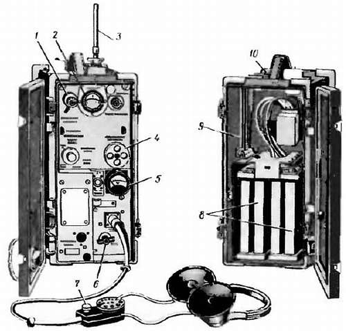 1 — ручка настройки антенны; 2 — шкала настройки приемопередатчика; 3 — антенна; 4 — ручка установки рабочей частоты; 5 — прибор проверки источников питании; 6 — выключатель питании, 7 — кнопка переключателя «Прием-передача»; 8 — аккумуляторная батарея; 9 — удлинительные колена штыревой антенны; 10 — зажим для подключения противовеса (заземления)