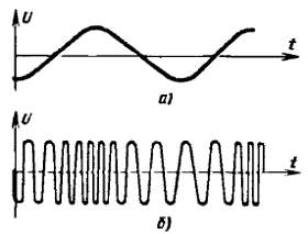 Рис. 402. Графики, иллюстрирующие принцип частотной модуляции: а — колебания звуковой частоты; б — частотно-модулированные колебания радиочастоты