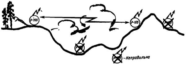 Рис. 407. Развертывание УКВ радиостанции в гористой местности