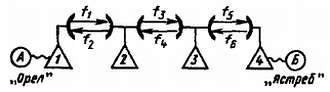 Пункты связи А и Б условно названы «Орел» и «Ястреб». Сигнал станции 1 «Орел» на частоте f1 передается промежуточной станции 2, усиливается ею и ретранслируется на частоте f3 к станции 3, которая на частоте f5 излучает усиленный сигнал к станции 4 «Ястреб». Таким же образом, но в обратном порядке, передается сигнал от «Ястреба» к «Орлу» на частотах f6, f4 и f2. Здесь станции 1 и 4 — конечные, а станции 2 и 3 — промежуточные. Поскольку сигналы от станции к станции передаются на разных частотах, взаимные помехи между станциями практически исключены.