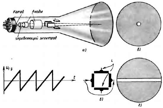 В РЛС отсчет времени ведется при помощи электронного секундомера, роль которого обычно выполняет электронно-лучевая трубка. В простейшем виде она, подобно трубке осциллографа, представляет собой стеклянный баллон с электродами и сильным разрежением воздуха внутри (рис. 412, а). Экраном служит плоская широкая часть трубки, покрытая с внутренней стороны тонким слоем люминофора — полупрозрачного вещества, светящегося под ударами электронов. Катод электронно-лучевой трубки подобен подогревному катоду электронной лампы. Он окружен металлическим цилиндром с небольшим отверстием посередине, через которое вылетают излучаемые катодом электроны. Это управляющий электрод трубки.
