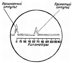 Рис. 413. Выброс светящейся линии на экране электронно-лучевой трубки указывает расстояние до цели