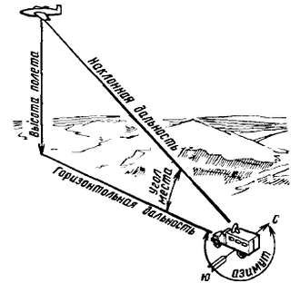 Как операторы РЛС определяют текущие координаты обнаруженного объекта, например самолета? По его азимуту, т. е. по углу между направлением на север и направлением на самолет, и по углу места углу, образуемому горизонтальной линией и наклонной линией, направленной на самолет (рис. 414).