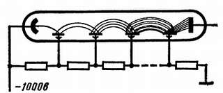 Рис. 27. Для питания многокаскадного фотоумножителя лучше подавать смещение на диоды с помощью цепочки резисторов, включенной между катодом (с высоким отрицательным потенциалом) и корпусом.