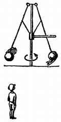 Н. — Здесь, должно быть, можно использовать регулятор с шарами, как в паровых машинах; ты прекрасно знаешь, что он представляет собой ось, на которой вращаются два шара, соединенных с нею рычагами: когда ось вращается быстро, центробежная сила разводит эти шары в стороны.