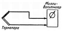 Рис. 21. Термопара состоит из двух спаянных кусочков разных металлов. При нагревании места спая на выводах термопары появляется напряжение, повышающееся при увеличении температуры.