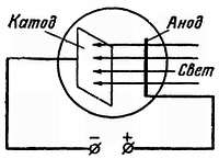 Рис. 22. Фотоэлектрический элемент. Под воздействием света катод испускает электроны, а анод эти электроны собирает.