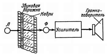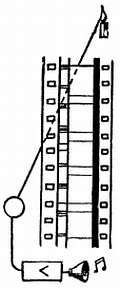 Рис. 23. С одного края кинопленки находится звуковая дорожка переменной прозрачности. При движении пленки в кинопроекторе звуковая дорожка в большей или меньшей степени ослабляет световые лучи, идущие от лампы Л к фотоэлектрическому элементу Ф; таким образом воспроизводится ток низкой частоты звукового сопровождения.