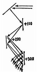 Л. — Двадцать из двадцати, дорогой Незнайкнн! Для использования этого явления в фотоэлементах делают так, что электроны, исходящие с освещенного катода (его потенциал равен 0), попадают на первый электрод (с потенциалом +100 в). Этот электрод покрыт веществом, обладающим большой вторичной эмиссией, а расположен он рядом с другим электродом с потенциалом +200 в. На каждый электрон, вылетевший с фото катода и попавшим на электрод с потенциалом +100 в, с этого электрода вырывается 2 или 3 электрона, которые летят на электрод с потенциалом +200 в. Рядом с последним еще один электрод с потенциалом +300 в. он получает уже 4 или 9 электронов (рис. 26).