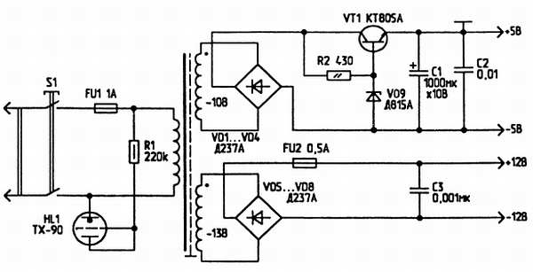 Автомат световых эффектов питается от электросети с напряжением 220 В с помощью блока питания, принципиальная схема которого приведена на рис. 17. Блок питания представляет собой трансформаторный выпрямитель, состоящий из двух диодных мостов. Первый из них, VD1-VD4, оснащен электронным стабилизатором напряжения 5 В и предназначен для питания микросхем автомата. Второй диодный мост, VD5-VD8, служит источником питания ламп напряжением 12 В.