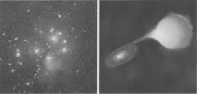 Рис. 8.2. В галактиках часть звезд объединена в звездные скопления, похожие на Плеяды (слева). В бедных скоплениях, содержащих до дюжины звезд, их движение носит регулярный характер: относительное расположение соседей сохраняется. В крупных скоплениях звезды движутся хаотически, но при этом они часто объединены в пары и иногда могут обмениваться веществом, как это наблюдается у гигантской звезды Мира в созвездии Кита и ее соседа — белого карлика (справа).