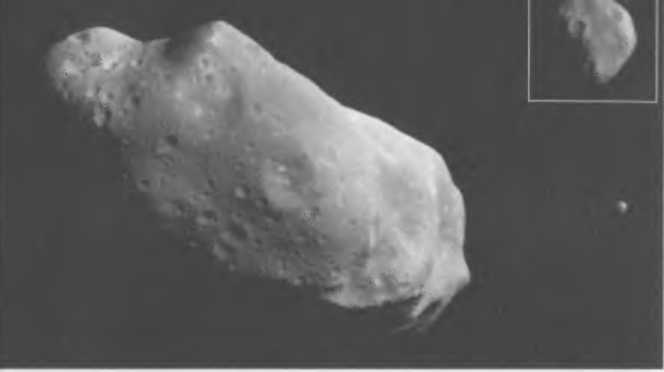 Рис. 8.3. Астероид Ида (243 Ida) размером 54?24?15 км и его спутник Дактиль (Dactyl) размером около 1,5 км, сфотографированные в 1993 г. в момент пролета мимо них межпланетного зонда «Галилео» (NASA), направлявшегося к Юпитеру. Общий снимок получен с расстояния 10 500 км, а снимок Дактиля (на врезке) с расстояния 3900 км. Фото: NASA, JPL, USGS.