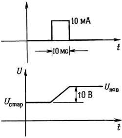Импульс тока продолжительностью 10 мс вызовет увеличение напряжения на конденсаторе на 10 В (рис. 1.28).