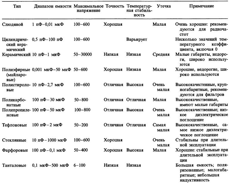 Промышленностью выпускается много типов конденсаторов. Здесь перечислены основные преимущества и недостатки различных типов. Очевидно, что данная оценка имеет несколько субъективный характер (см. таблицу).