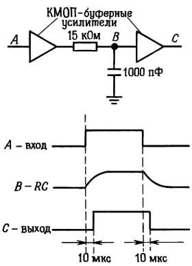 В виде треугольников изображены КМОП-буферные усилители. Они дают высокий уровень на выходе (более половины величины напряжения питания постоянного тока) и наоборот. Первый буферный усилитель воспроизводит входной сигнал и обеспечивает небольшое выходное сопротивление, предотвращая тем самым воздействие на источник сигнала RС-цепи (вопрос о нагрузке схемы мы рассмотрели в разд. 1.05). Согласно характеристике RС-цепи, выходной сигнал для нее задерживается относительно входного, поэтому выходной буферный усилитель переключается на 10 мкс позже скачка напряжения на входе (напряжение на выходе RС-цепи достигает 50 % своего максимального значения через 0,7RC.
