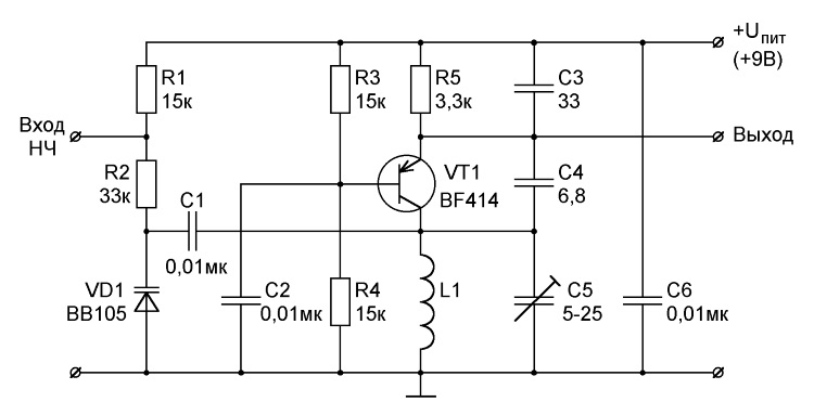 Варикап VD1 подключен параллельно катушке индуктивности L1 и подстроечному конденсатору С5, которые входят в состав резонансного контура. Напряжение смещения подается на варикап через резисторы R1 и R2. Конденсатор С1 большой емкости обеспечивает развязку варикапа VD1 и коллектора транзистора VT1 по постоянному току. Модулирующий НЧ-сигнал подается на варикап через резистор R2. Модулированный сигнал снимается с эмиттера транзистора VТ1.