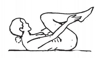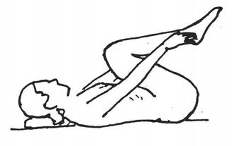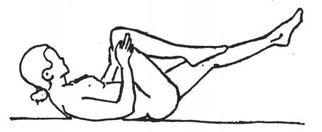 Лечь на пол, выпрямить ноги и развести их на ширину ступни. Глубоко вдыхая, медленно сгибать колени, подтягивая их к груди. Постепенно, медленно выдыхаем, зафиксировав положение и придерживая лодыжки ног ладонями. Не расслабляя пресс (рис. 39), так же медленно и плавно вернуться со вдохом в исходное положение. Повторить упражнение 9-10 раз.