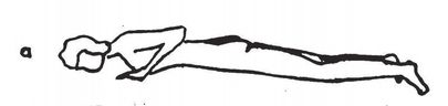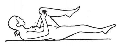 3. Исходное положение — лежа на спине, колени подтянуты к груди (как на рис. 39). Вдохнуть и на сильном мощном выдохе оторвать голову и плечи от пола, вытянув левую ногу параллельно полу. Плавно вернуться в исходное положение. Повторить с правой ногой аналогично (рис. 41-42).