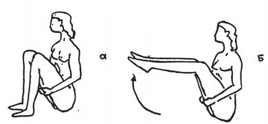 5. Исходное положение — сидя на полу, согнуть ноги, обхватить бедра руками, скрепив ладони замком, оторвав ступни от пола и выпрямить спину (рис. 44 а). Не сгибая спину, выпрямите и поднимите ноги так, чтобы голени находились параллельно полу. Бедра стараться держать как можно более вертикально (рис. 44 б).
