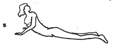 6. Исходное положение — лежа на животе, ноги вместе, руки согнуты в локтях, опираются ладонями на уровне груди, подбородок упирается в пол (рис. 45 а). Медленно, как бы растягивая позвоночник, опираясь на руки, не отрывая живот от пола, прогибаемся назад. Поворачиваем одновременно голову и корпус тела влево, стараясь увидеть пятку правой ноги. Левое бедро от пола при этом не отрывать (рис. 45 б).