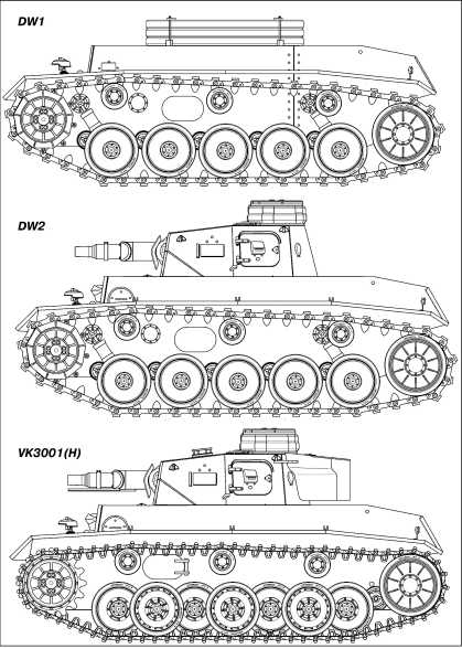 Реальная работа по созданию нового тяжелого танка в рамках программы Panzerkampfwagen VI началась в конце января 1937 года, когда фирма Henschel получила заказ на проектирование боевой машины под условным индексом DW1 (Durchbruchwagen — машина прорыва). Корпус этого 30-тонного танка состоял из двух частей, соединявшихся друг с другом болтами, — металлургические заводы еще не могли в то время изготовить катаные броневые листы большого размера толщиной 50 мм. Ходовая часть состояла из пяти обрезиненных опорных и трех поддерживающих катков на борт, ведущего колеса переднего расположения с гребневым зацеплением и гусеницы шириной 300 мм. Подвеска — индивидуальная, торсионная. Проходившее испытания шасси танка с балластом вместо башни оснащалось 280-сильным двигателем Maybach HL 120, коробкой передач Maybach Variorex и механизмом поворота типа Cletrac. Максимальная скорость движения — 35 км/ч.