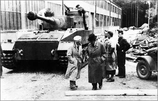 На следующий день обе машины прибыли в Ставку. В 10.30, как это следует из воспоминаний Эрвина Адерса, начали собираться руководители Рейха и Вермахта. Геббельс и Геринг отсутствовали. Когда в 11.00 появился Гитлер, сотрудники фирм-изготовителей выстроились для представления фюреру. Затем состоялось награждение Фердинанда Порше Крестом за военные заслуги I-го класса. После торжественной части Гитлер около получаса осматривал машину Порше, внимательно выслушивая объяснения конструкторов. Танку Хеншеля он уделил всего 2–3 минуты, задал Адерсу один вопрос и отошел. Затем состоялся показ танков в движении.