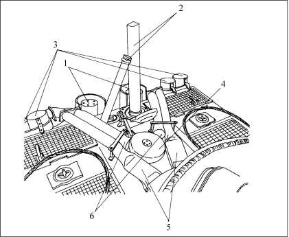 Крыша моторного отделения с установленным оборудованием для подводного вождения: 1 — выхлопные патрубки; 2 — труба ОПВТ; 3 — воздушные фильтры типа Feifel; 4 — колпак над окном воздухооттока; 5 — трубы подачи воздуха к воздушным фильтрам двигателя; 6 — трубы подачи воздуха к фильтрам типа Feifel.
