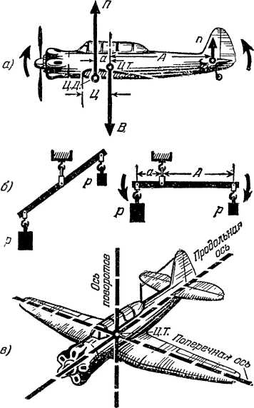 Самолет в воздухе может вращаться вокруг многих воображаемых осей, проходящих через центр тяжести. Главными из них являются три взаимно перпендикулярные оси: поперечная, продольная и ось поворотов (рис. 22, в). Поэтому моменты сил удобнее рассматривать относительно этих осей.