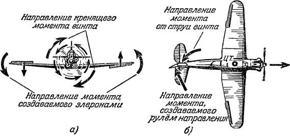 Путевое равновесие летчик получает с помощью руля направления (рис. 23, б). При отклонении руля на него действует аэродинамическая сила и создается заворачивающий момент, который может уравновесить какой-либо заворачивающий момент противоположного направления, например, момент от действия струи винта на вертикальное оперение (вращающийся винт отбрасывает вращающуюся же струю воздуха, которая действует на вертикальное оперение с той или другой его стороны в зависимости от направления вращения винта).