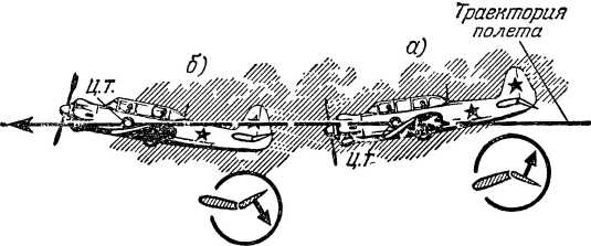 Для устойчивого равновесия самолета в полете большую роль играет положение его центра тяжести. Центр тяжести самолета во всех случаях лежит позади передней кромки крыла (рис. 22, а).